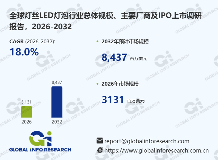 按照本项目团队最新调研,估计2032年全球灯丝LED灯胆产值达到8437百万美元,2026-2032年期间年复合增加率CAGR为18。0%。